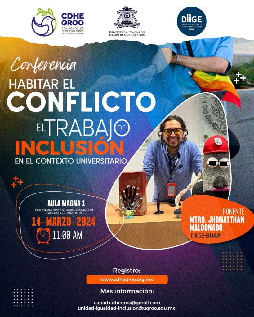 (11/Marzo/2024). -La Comisión de los Derechos Humanos del Estado de Quintana Roo (CDHEQROO), con la colaboración de la Universidad Autónoma de Quintana Roo, que dirige la Dra. Natalia Fiorentini Cañedo, realizarán la conferencia “Habitar el conflicto, el trabajo de inclusión en el contexto universitario”, que partirá sobre los enfoques de diversidad sexo-genérica y discapacidad.
