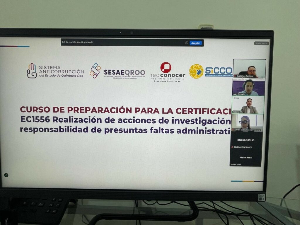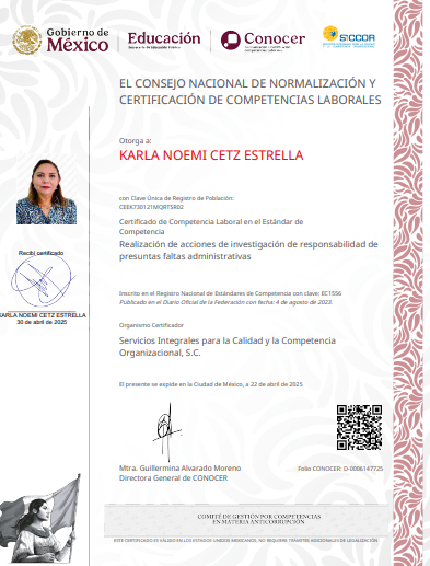 Abril 22, 2025.- Durante los meses de enero, febrero y marzo 2025 la Mtra. Karla Noemí Cetz Estrella, Titular del Órgano Interno de Control de la Comisión de los Derechos Humanos del Estado de Quintana Roo, atendiendo la invitación recibida por la Secretaría Ejecutiva del Sistema Anticorrupción del Estado de Quintana Roo (SESAEQROO), participó en los cursos de preparación para la Certificación en el Estándar de Competencia EC1556 la cual establece los conocimientos, habilidades y destrezas necesarias para llevar a cabo investigaciones de presunta responsabilidad administrativa cometidas por personas servidoras públicas, de manera eficiente y eficaz. El día 22 de abril previo al proceso de evaluación, la titular del Órgano Interno de Control, recibió la Certificación en el Estándar de Competencia EC1556. Felicidades!