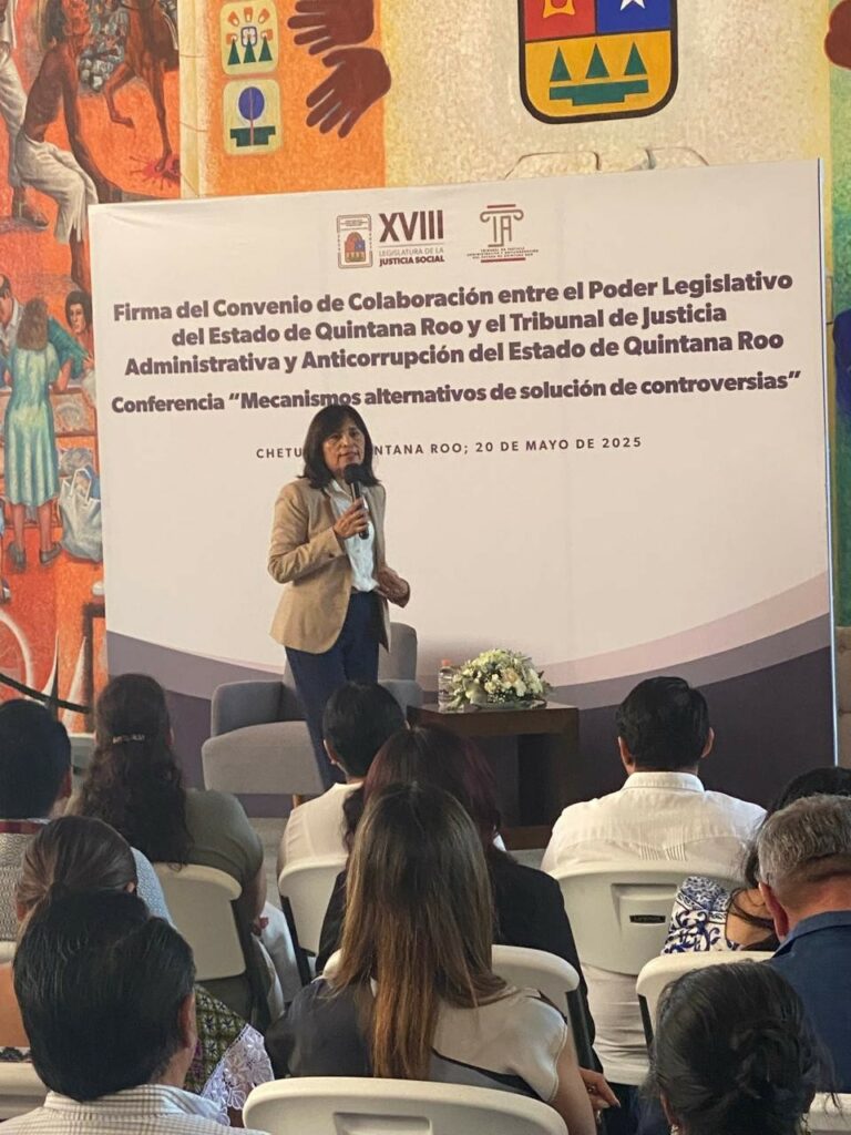 20 de Mayo 2025. La Mtra. Karla Noemí Cetz Estrella, Titular del Órgano Interno de Control de la CDHEQROO, asistió a la firma del Convenio de Colaboración entre el Poder Legislativo del Estado de Quintana Roo y el Tribunal de Justicia Administrativa y Anticorrupción del Estado de Quintana Roo. Este convenio tiene como objetivo, brindar el servicio de asistencia jurídica gratuita a las personas servidoras públicas del poder legislativo. Seguidamente se llevó a cabo la Conferencia “Mecanismos alternos de solución de conflictos” impartida por la Magistrada Minerva Maribel Moreno Cruz, Presidenta del Tribunal de Justicia Administrativa y Anticorrupción del Estado de Quintana Roo. Dicho evento se llevó a cabo en el Vestíbulo del Poder Legislativo en Chetumal, Quintana Roo.