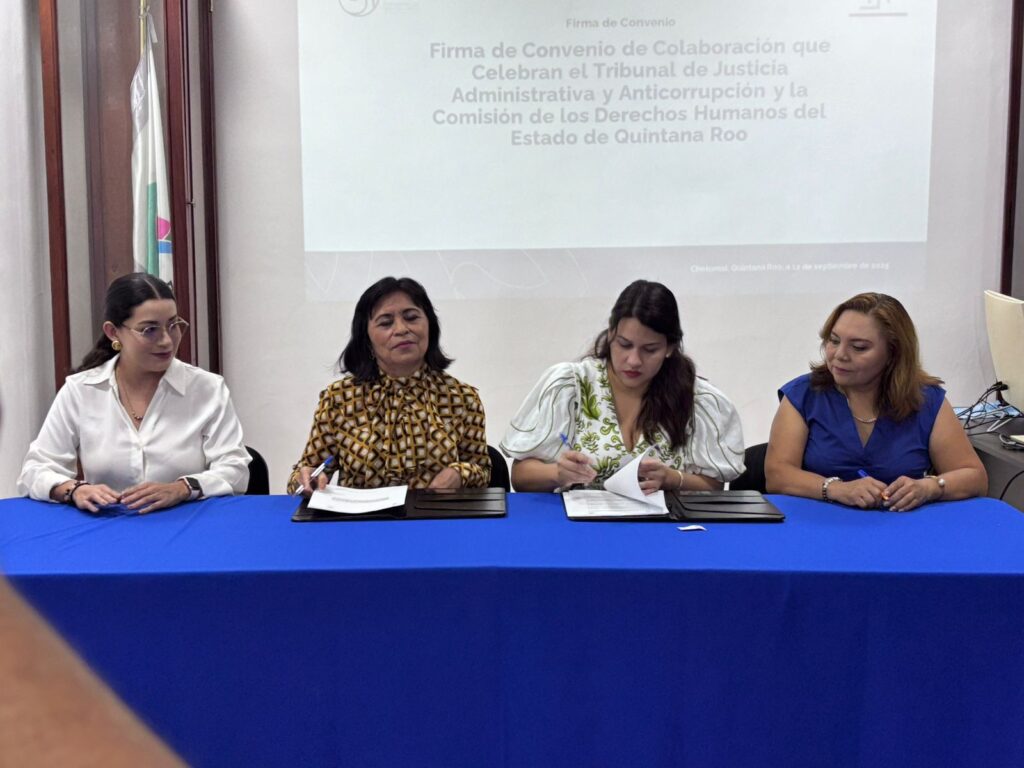 Participaron en esta firma de convenio, la Magistrada Presidenta del Tribunal de Justicia Administrativa y Anticorrupción del Estado de Quintana Roo, Dra. Minerva Maribel Moreno Cruz, la Presidenta de la CDHEQROO la Licda. Omega Istar Ponce Palomeque, asistidas por la Titular de la Unidad de Asistencia Jurídica y la Titular del Órgano Interno de Control, Mtra. Karla Noemí Cetz Estrella.