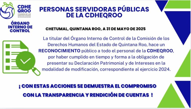 En cumplimiento a lo dispuesto en la Ley General de Responsabilidades Administrativas en sus Artículos 2, fracción IV; 3, fracción XXI; 9, fracción II y 10, así como la Ley de la Comisión de los Derechos Humanos del Estado de Quintana Roo en sus artículos 35bis y 35ter, fracciones I, II, III, IV y XII.
