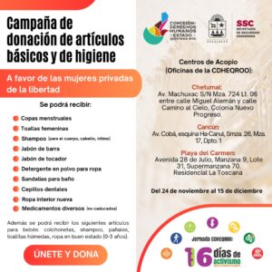 *CDHEQROO lanza campaña para recaudar insumos básicos y de higiene para mujeres privadas de la libertad e infantes.